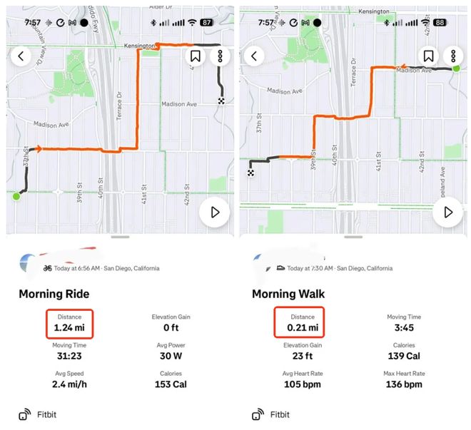 為了驗證這一問題,almosttan 對比了相似路線下的不同運動記錄。測試結果顯示,當記錄為“騎行”時,手表數(shù)據(jù)與 Google 地圖的測量結果基本一致;但在記錄“步行”時,手表顯示的距離竟然還不到實際距離的四分之一。這種巨大的數(shù)據(jù)斷層,顯然無法單純用 GPS 信號漂移來解釋。