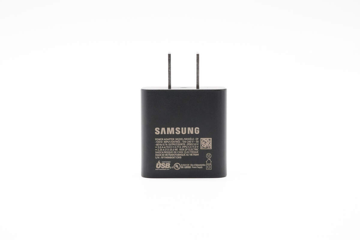 三星 25W 充電器采用黑色防火材質設計,外殼表面不易沾染指紋,邊緣圓潤過渡,手感細膩。